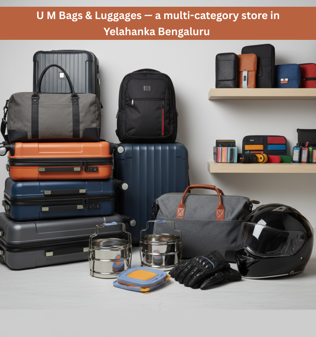 Find the best bags, helmets, and tiffins at U M Bags & Luggages, Yelahanka Bengaluru — your trusted local store for daily and travel essentials.